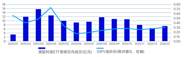 关于ETF规模,并不是越大就一定越好。规模较大的ETF通常流动性更好、买卖价差更小,但更重要的是看其是否紧密跟踪标的指数、跟踪误差是否在合理范围内。截至2026228日,港股科技ETF景顺上市以来日均跟踪偏离绝对值平均0.21%。(数据来源:Wind)体现出较好的指数跟踪能力。综合来看,投资者在选择港股科技ETF时,比起单纯看规模大小,关注跟踪效率、费率水平和流动性等综合指标更有意义。